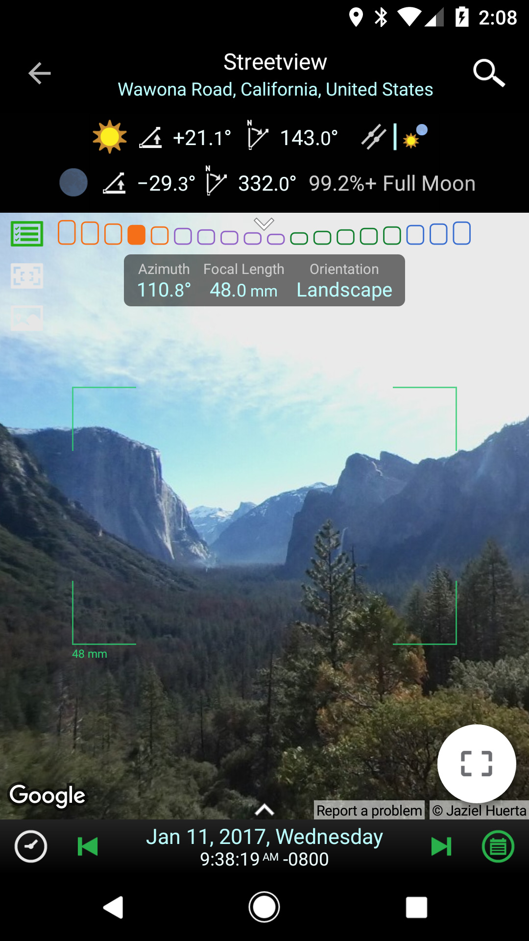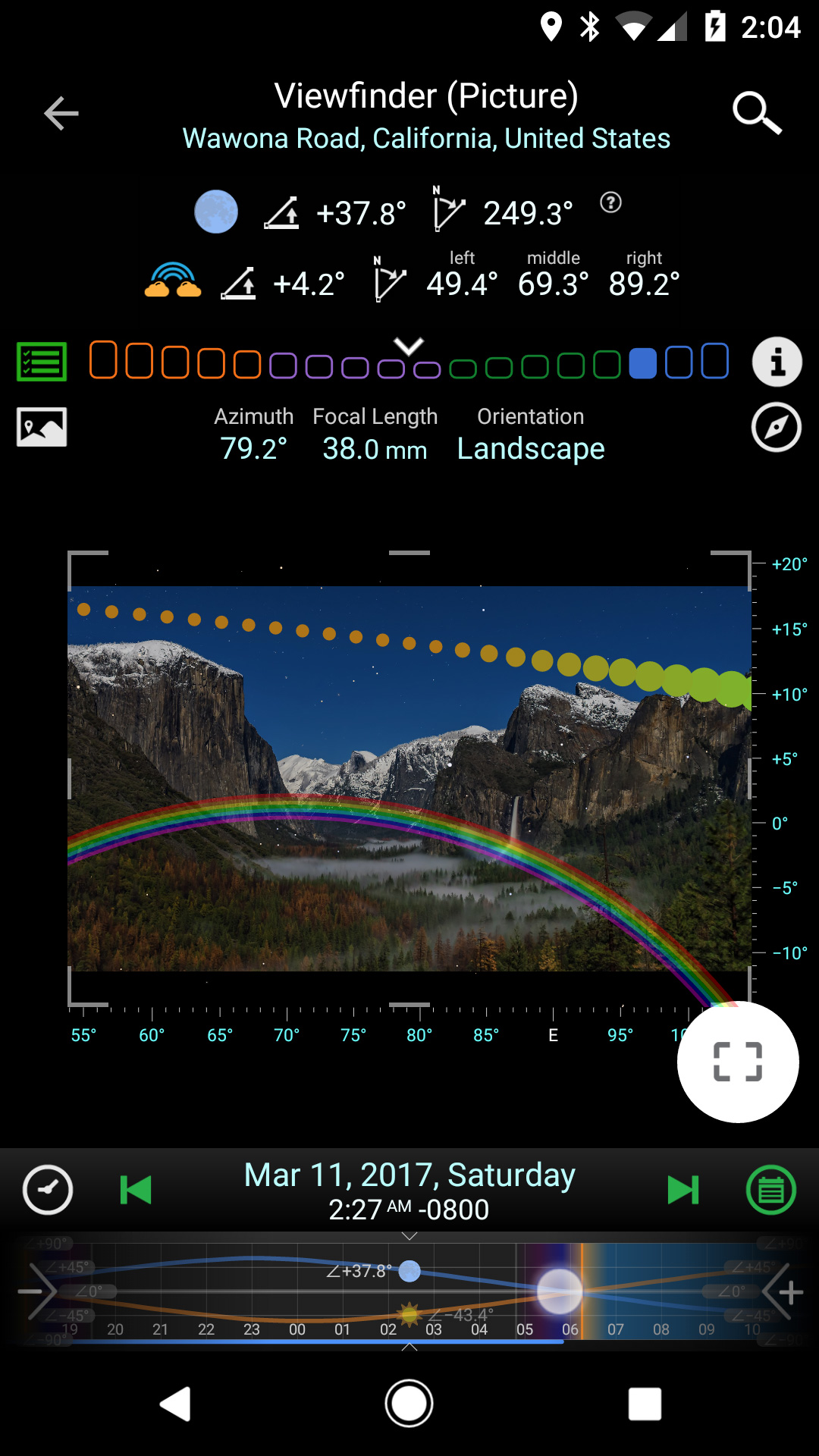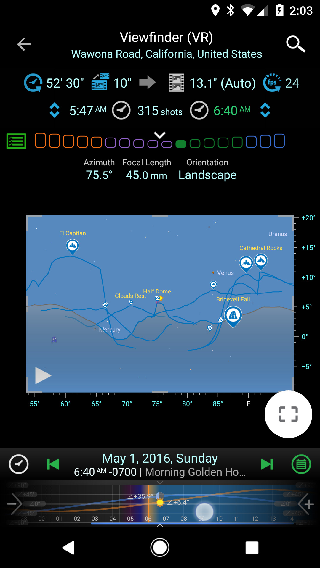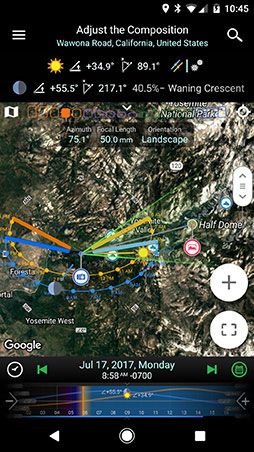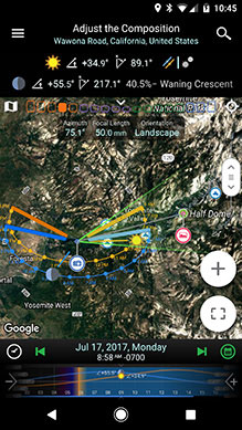 Great app, makes me want to do more photography So many good features, hard to go over one by one. The easy way of sliding the time and seeing the view changes is the most impressive. It even adjusts the view based on lense focal length. I heard from a friend about this app, and it replaces all the silly small sunrise sunset, tide apps I used before. This is an all in one app. Great work, worth much more than the price charged.